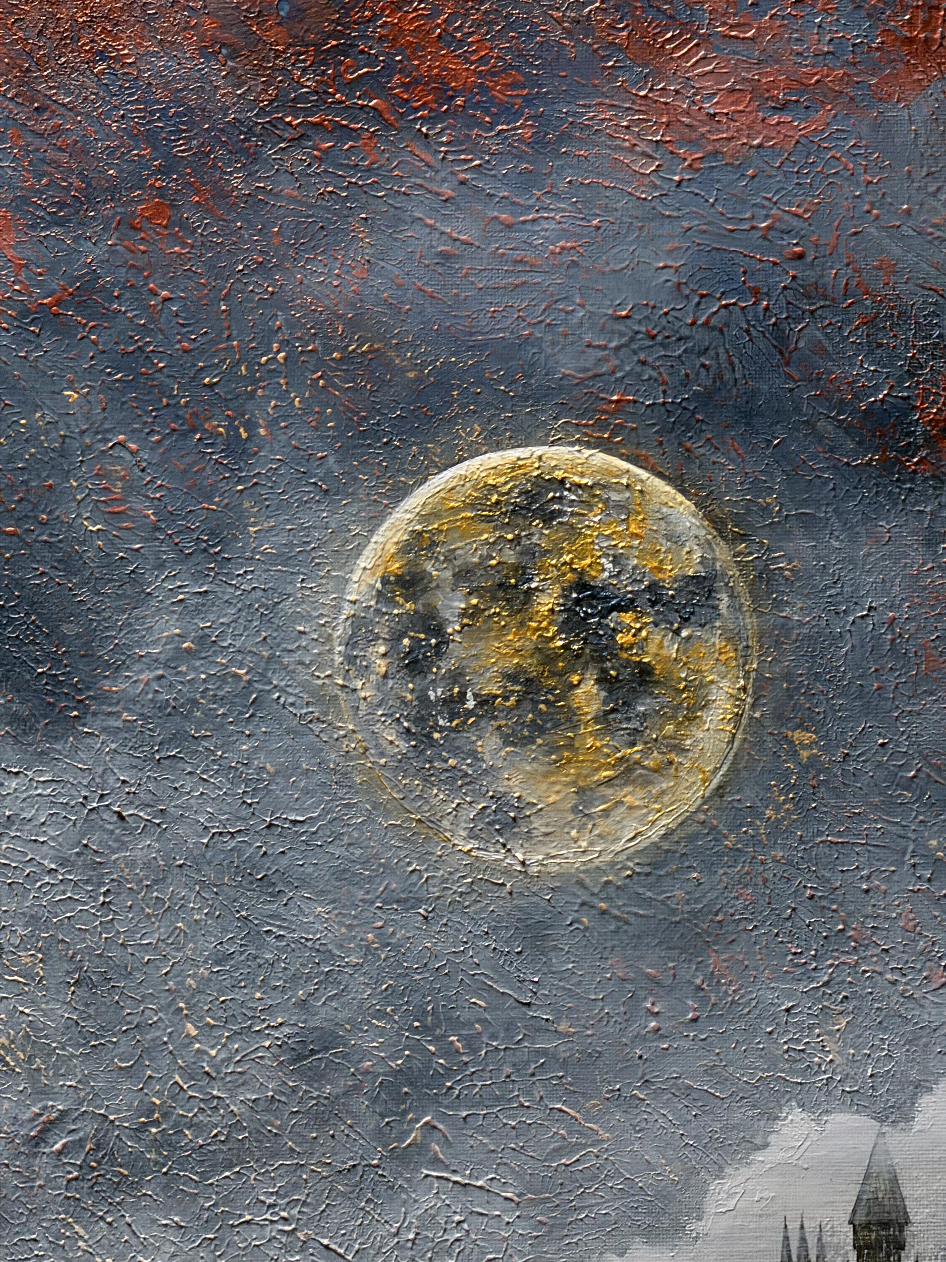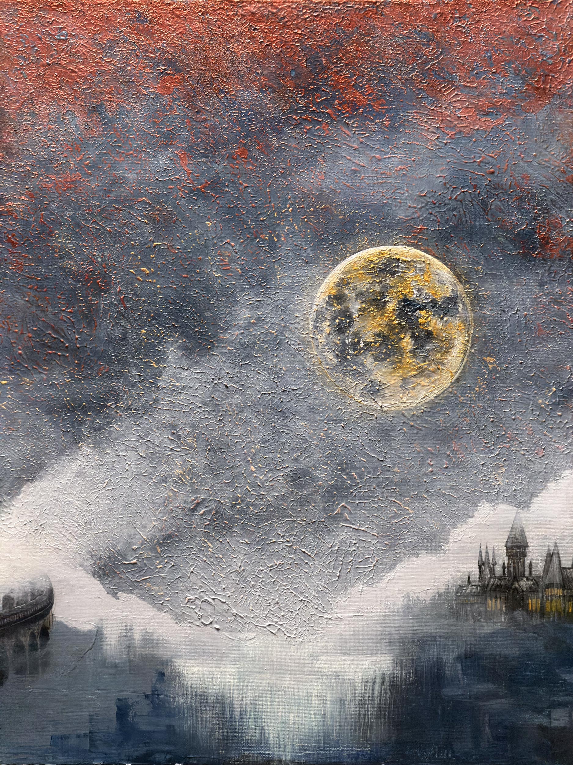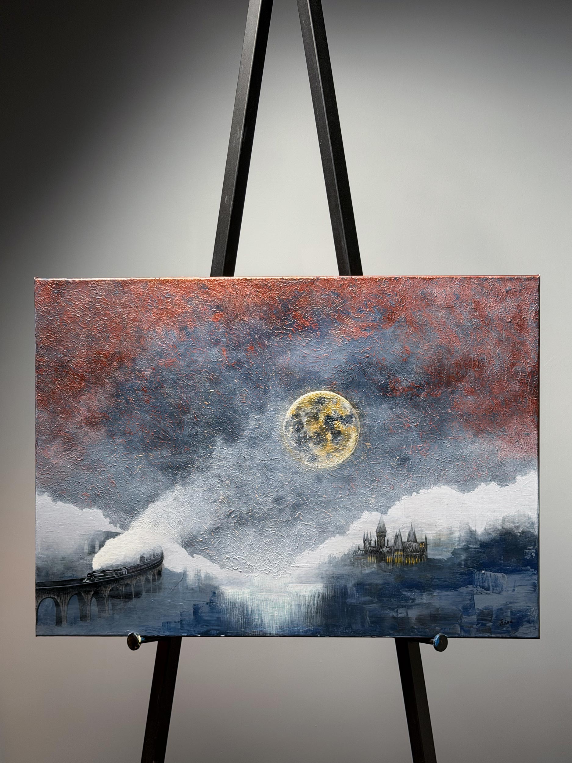 According to legend, whenever the massive Golden Moon appears in the sky, the gateway between the valley and the real world opens. The wise eyes waiting in the castle towers, upon hearing the sound of the train, open the castle gates wide and begin preparations to welcome the guests brought by the train. This is not just a journey, but a sacred ceremony of reunion gliding through the mists. The redness at the top of the painting is a reflection of the cosmic energy created by this mystic meeting.