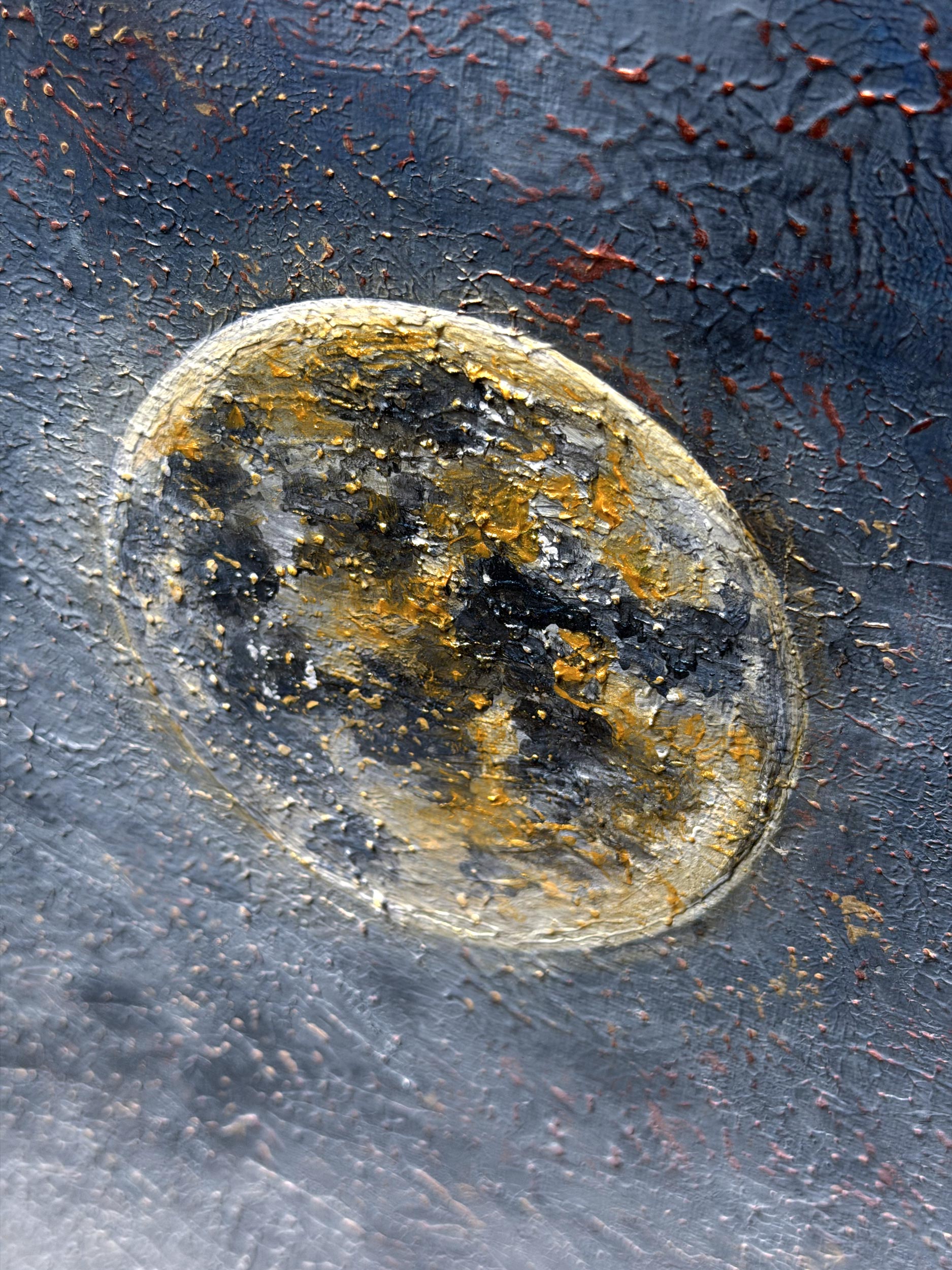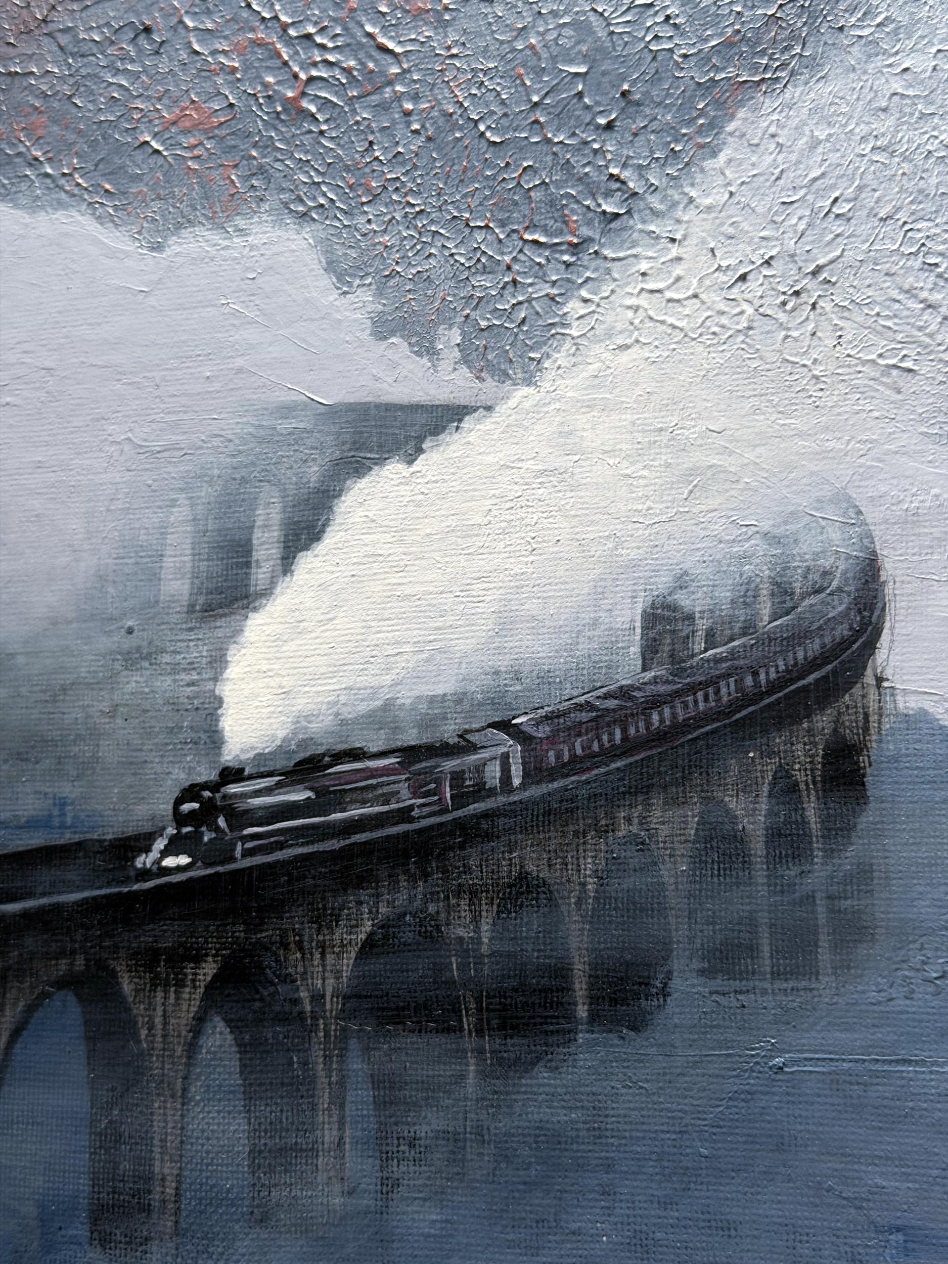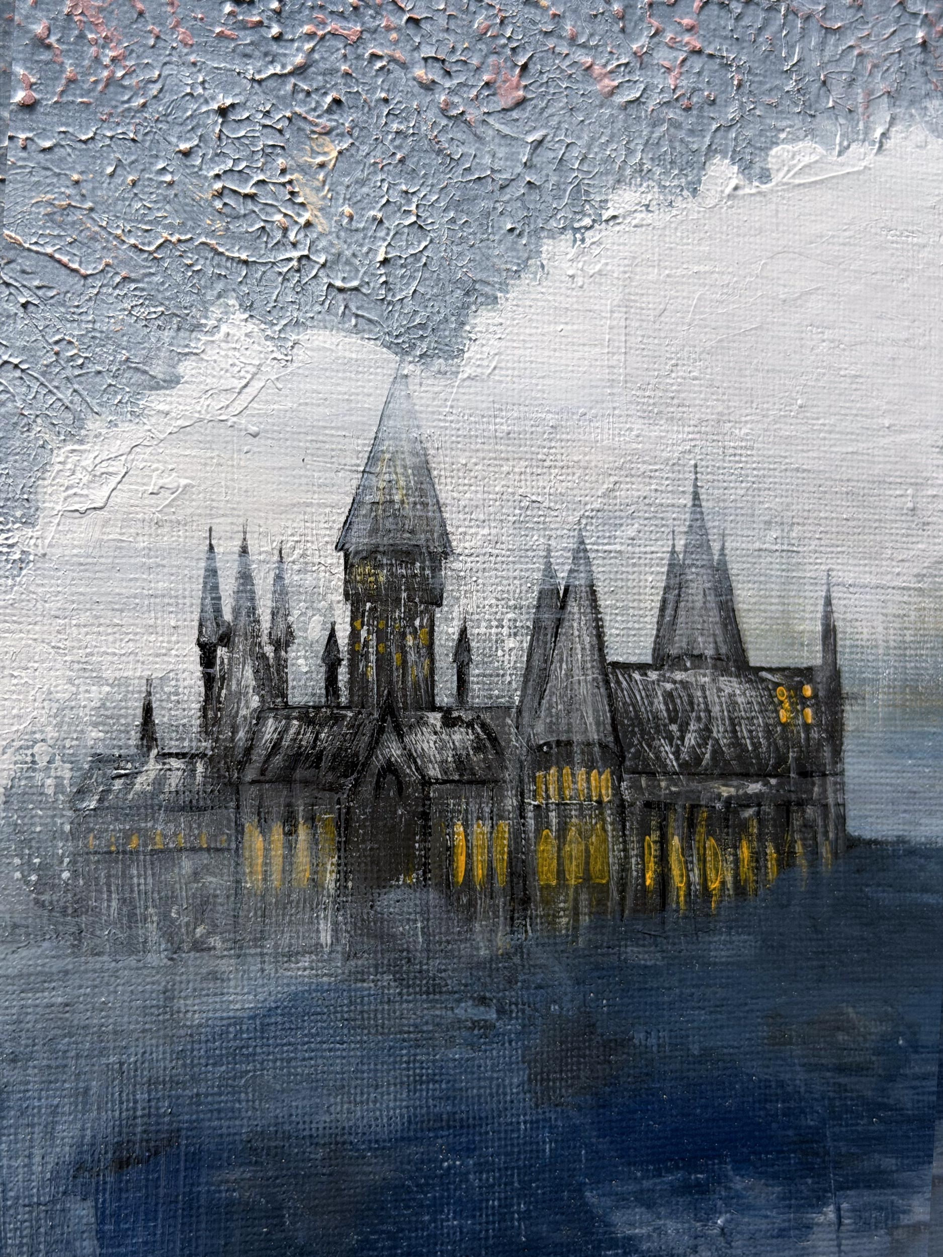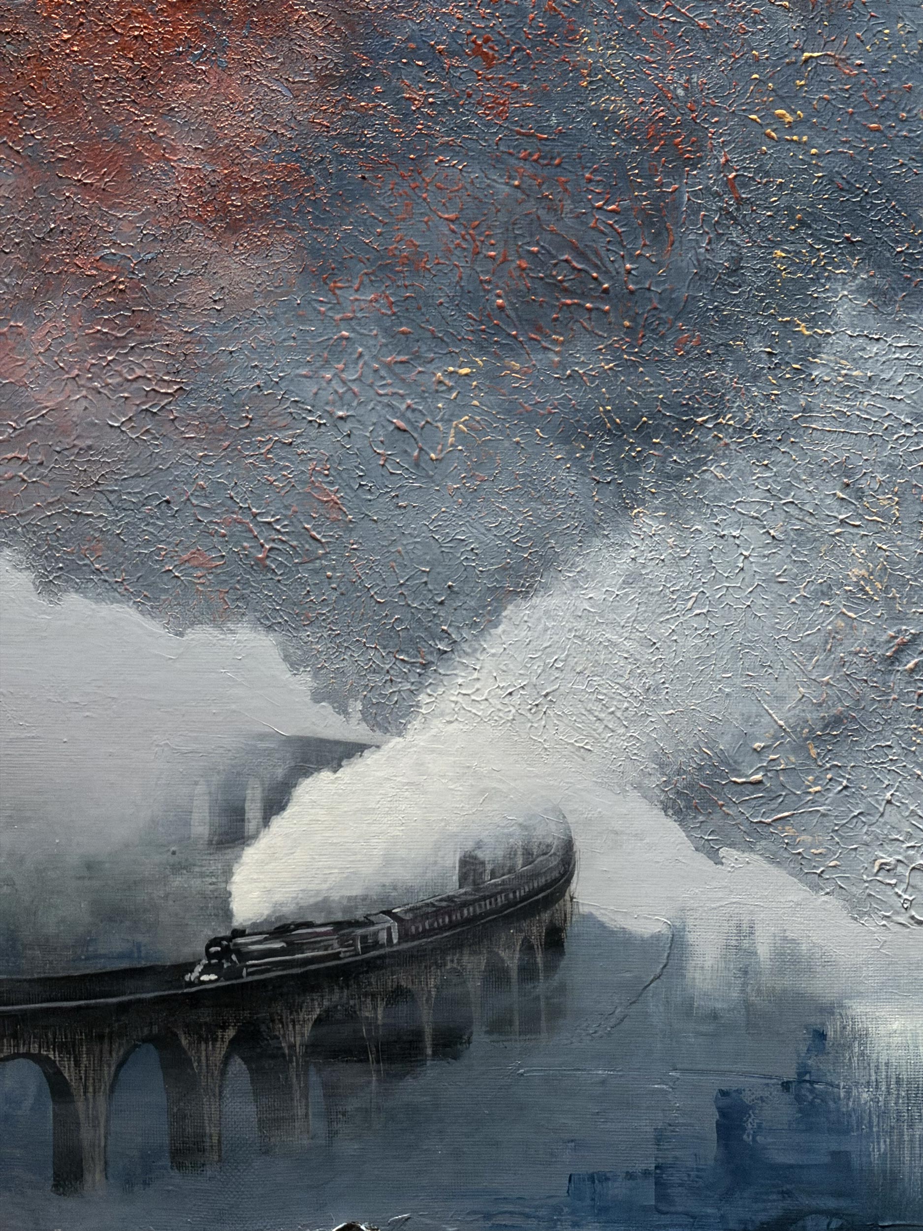 According to legend, whenever the massive Golden Moon appears in the sky, the gateway between the valley and the real world opens. The wise eyes waiting in the castle towers, upon hearing the sound of the train, open the castle gates wide and begin preparations to welcome the guests brought by the train. This is not just a journey, but a sacred ceremony of reunion gliding through the mists. The redness at the top of the painting is a reflection of the cosmic energy created by this mystic meeting.