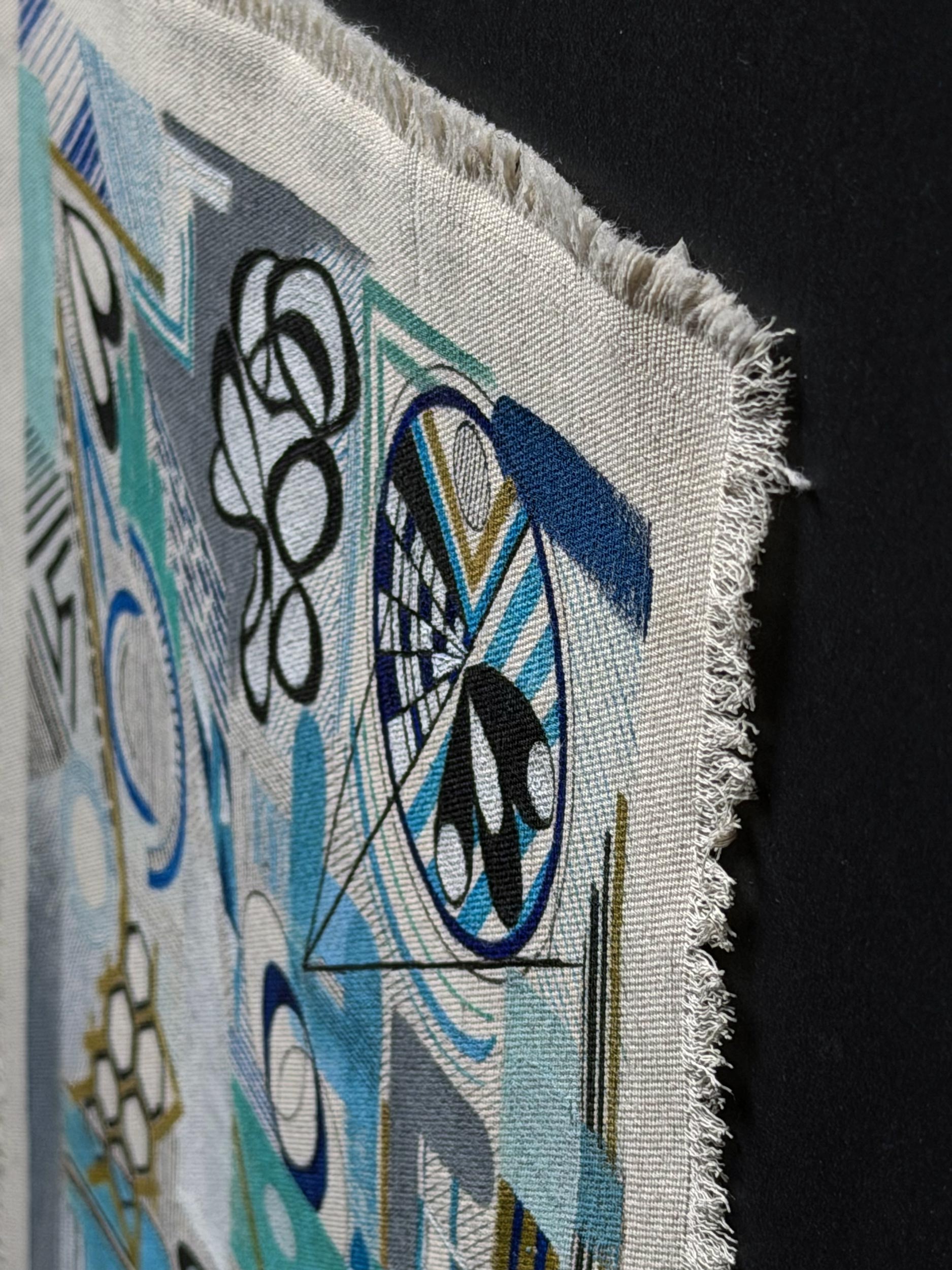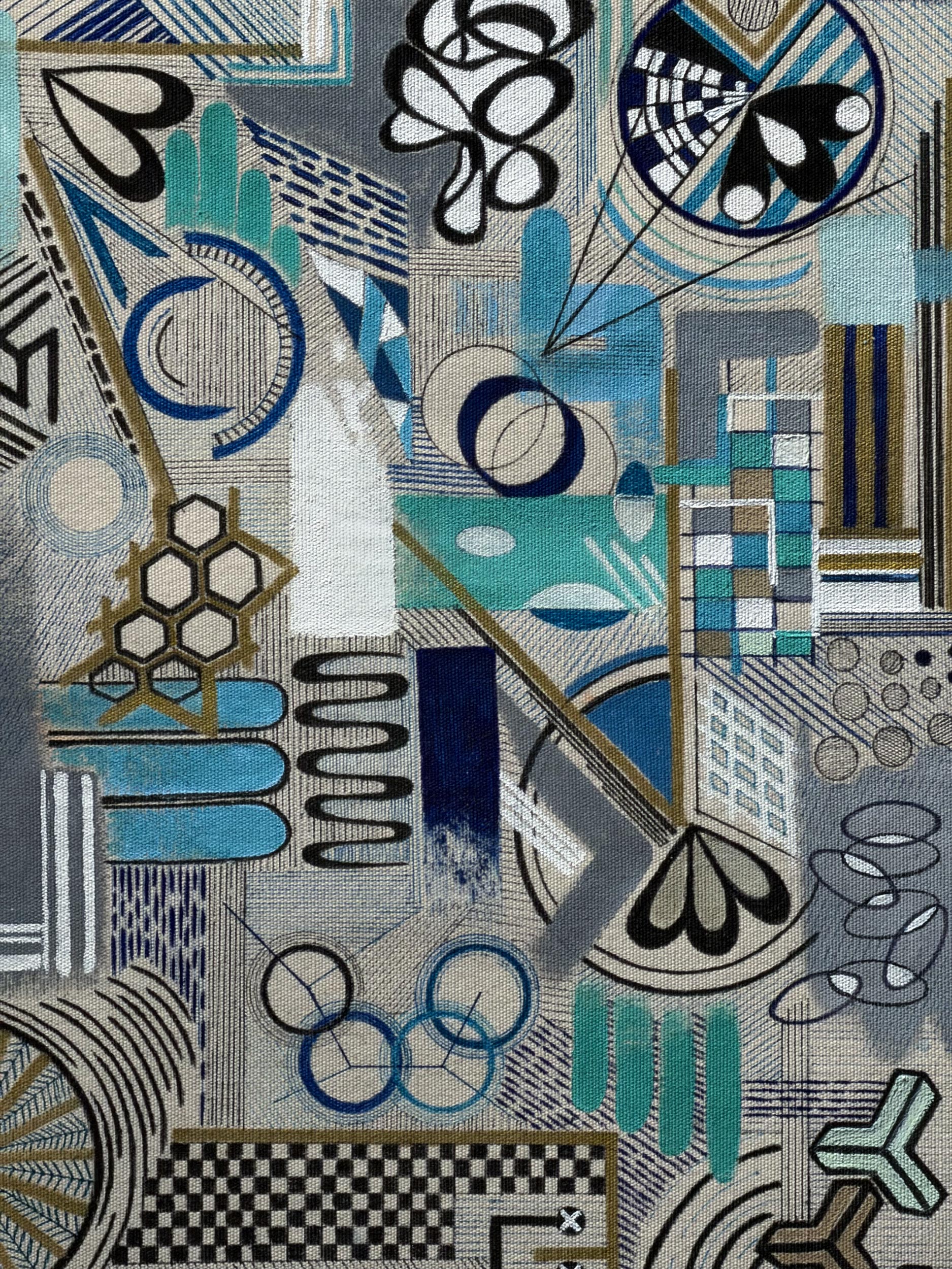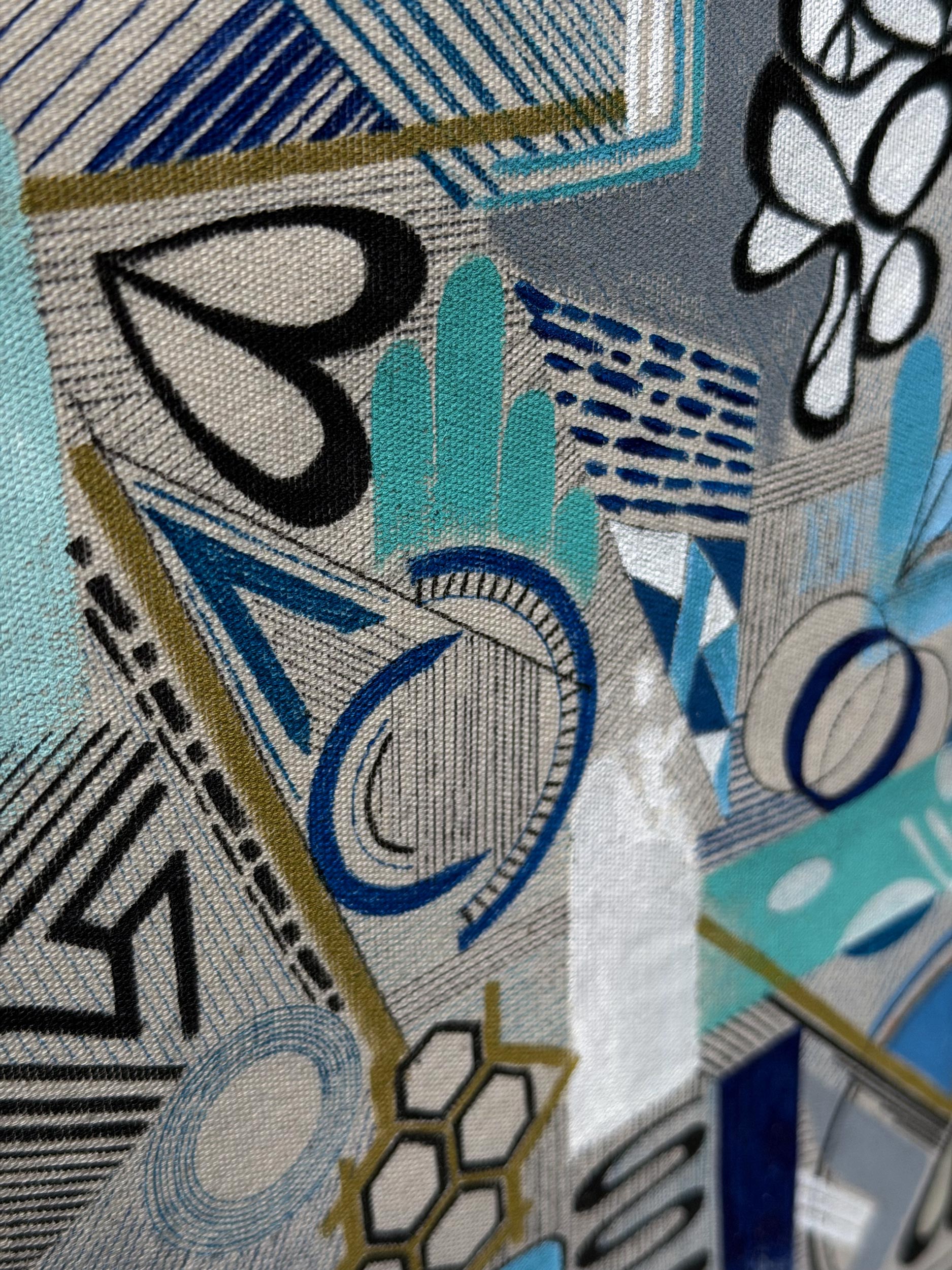 I poured the thoughts in my mind into concrete shapes. Every feeling within me turned into a line or a circle upon the fabric. Blue areas represented peace for me, while the complex black patterns conveyed the intensity in my mind at that moment. I expressed my emotions through the language of geometry.