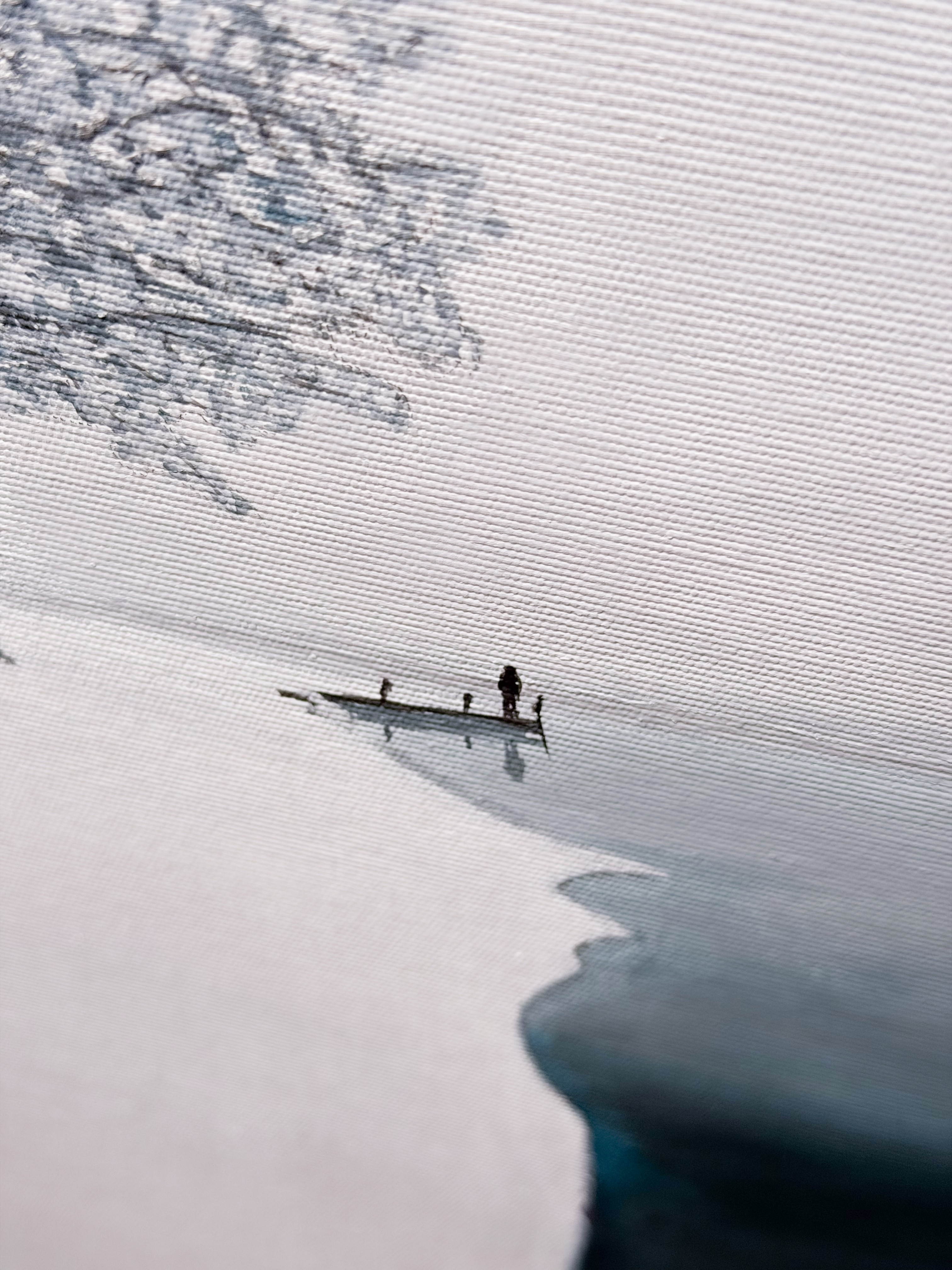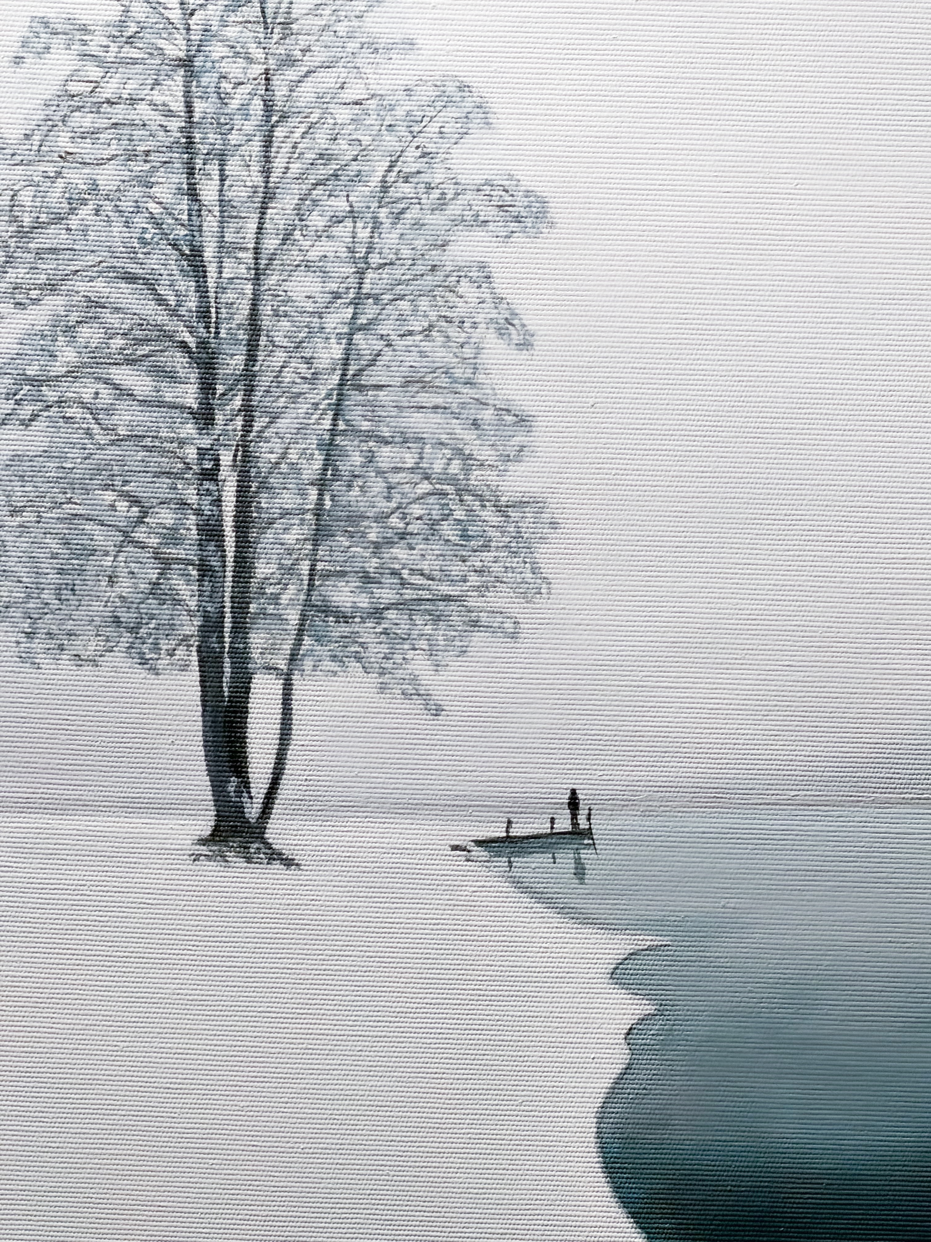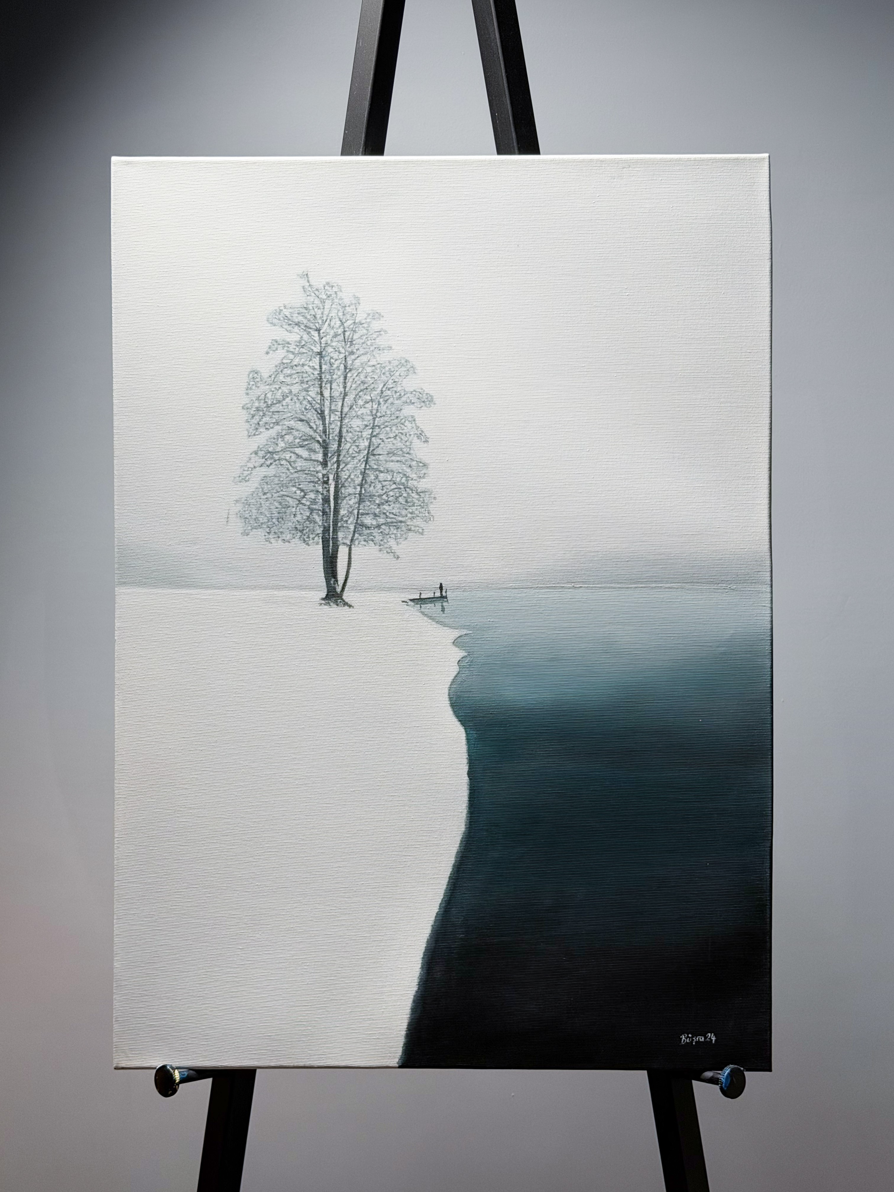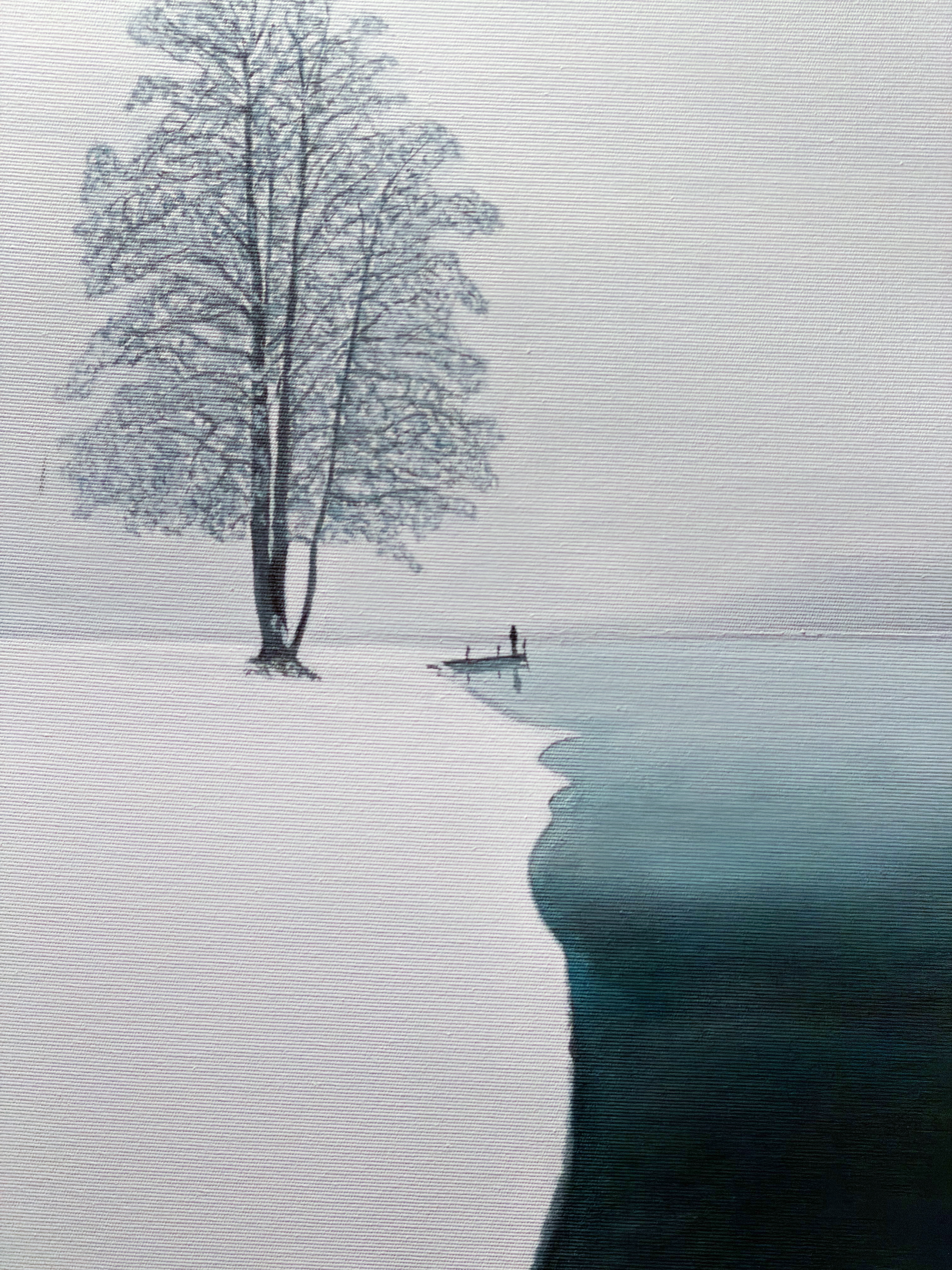 Frozen Moment depicts that thin line where existence and non-existence intersect. There is neither the sound of a bird nor the whisper of a wind; only a vast whiteness and a pitch-black silhouette defying this whiteness. Nature stops all its movement and leaves the human alone with the echo of their own inner voice, in the midst of this magnificent yet deafening silence.