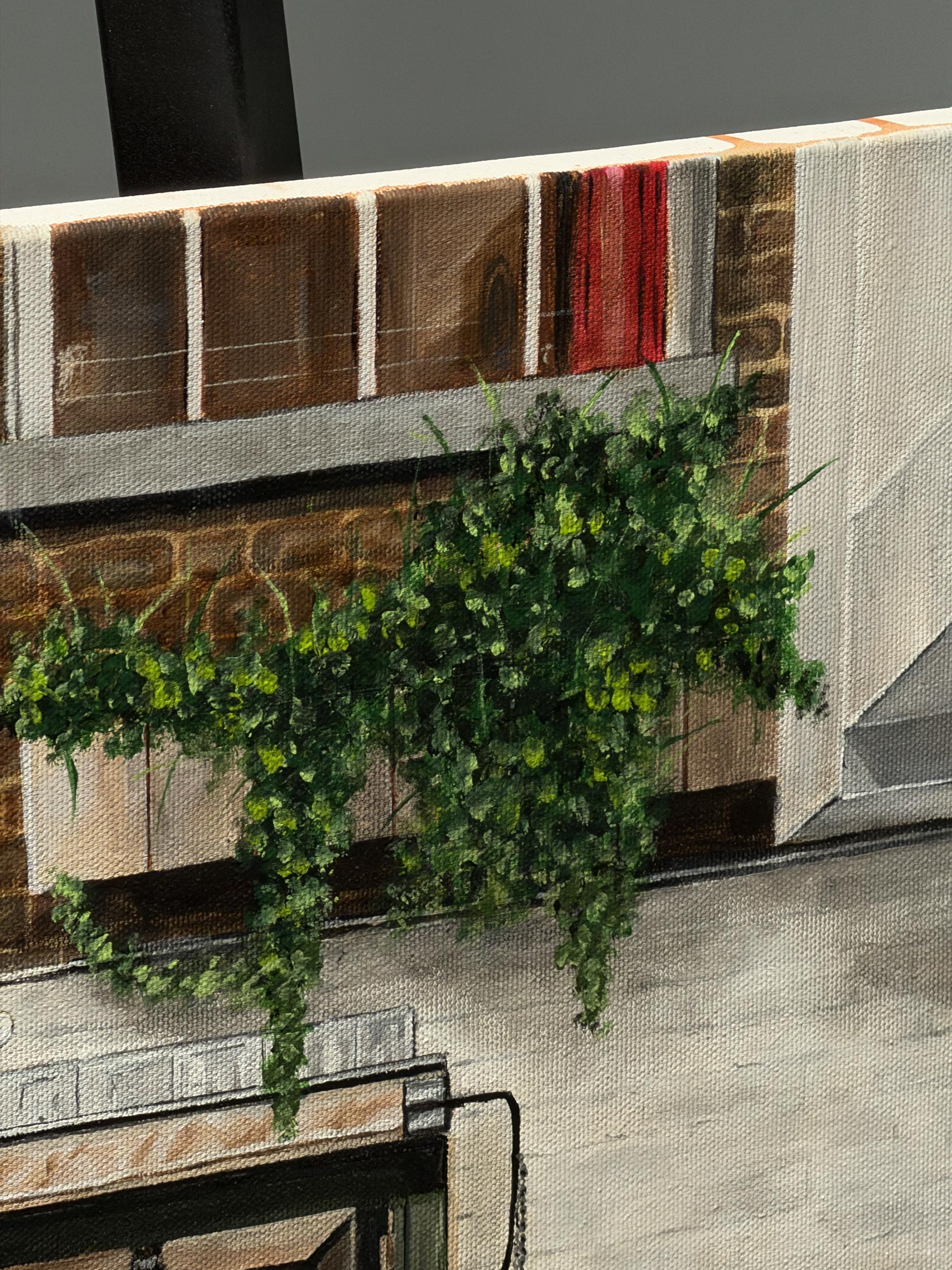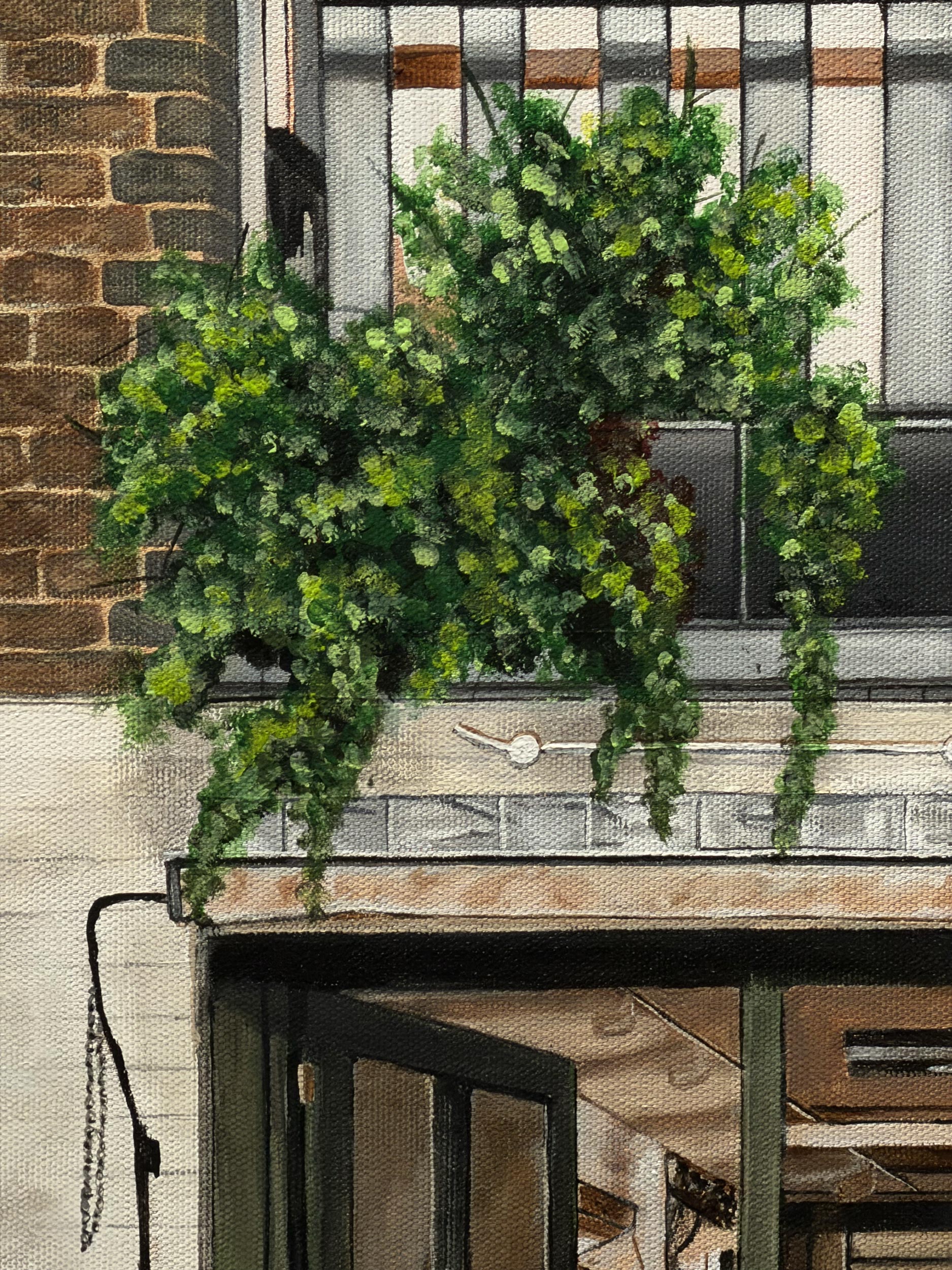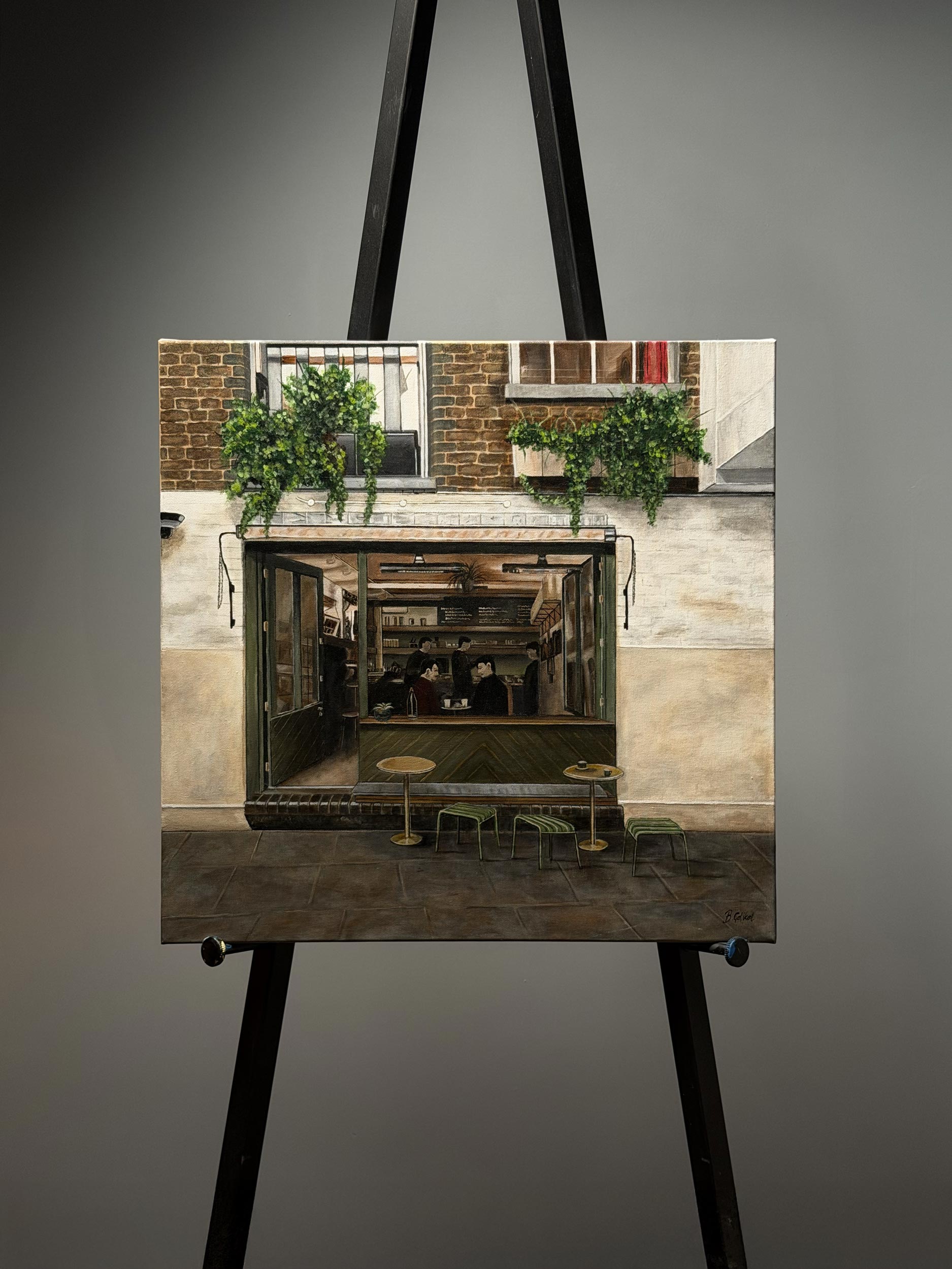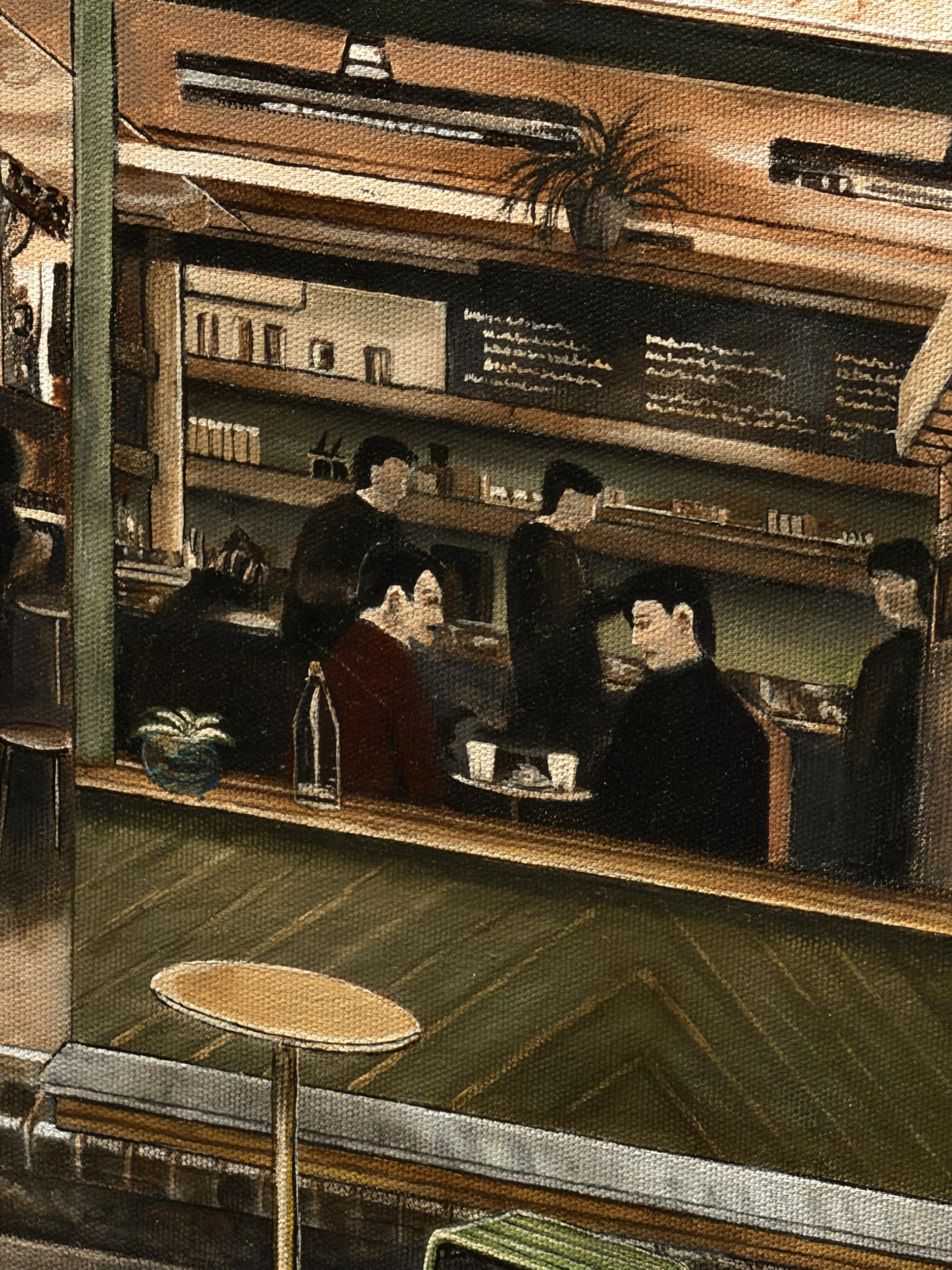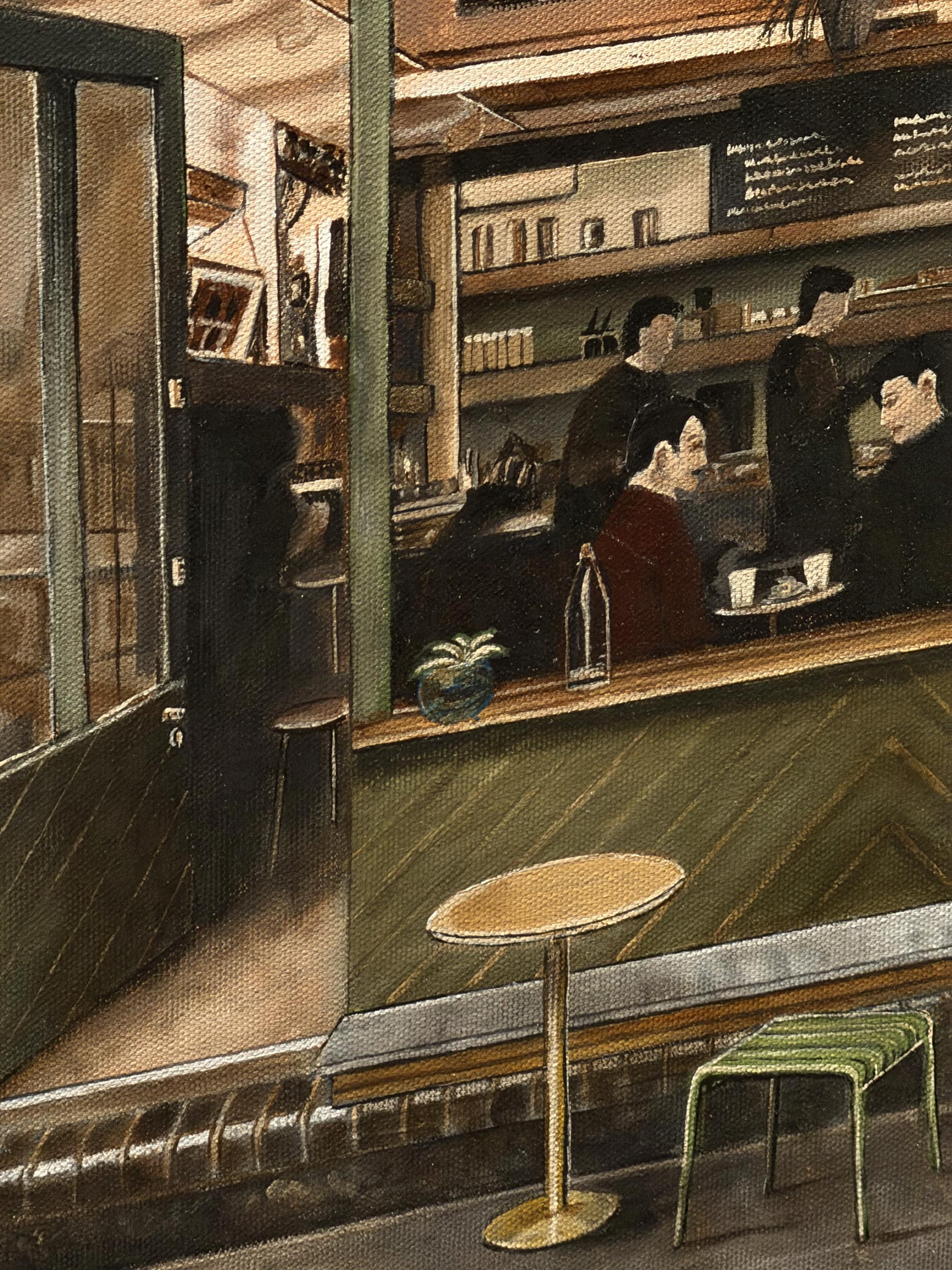 The empty stools standing outside serve as a reminder of those who had their coffee and just left. The seats occupied moments ago are still warm. Inside, the voices are still lively, while the street slowly retreats. The painting shows how a day quietly fades away.