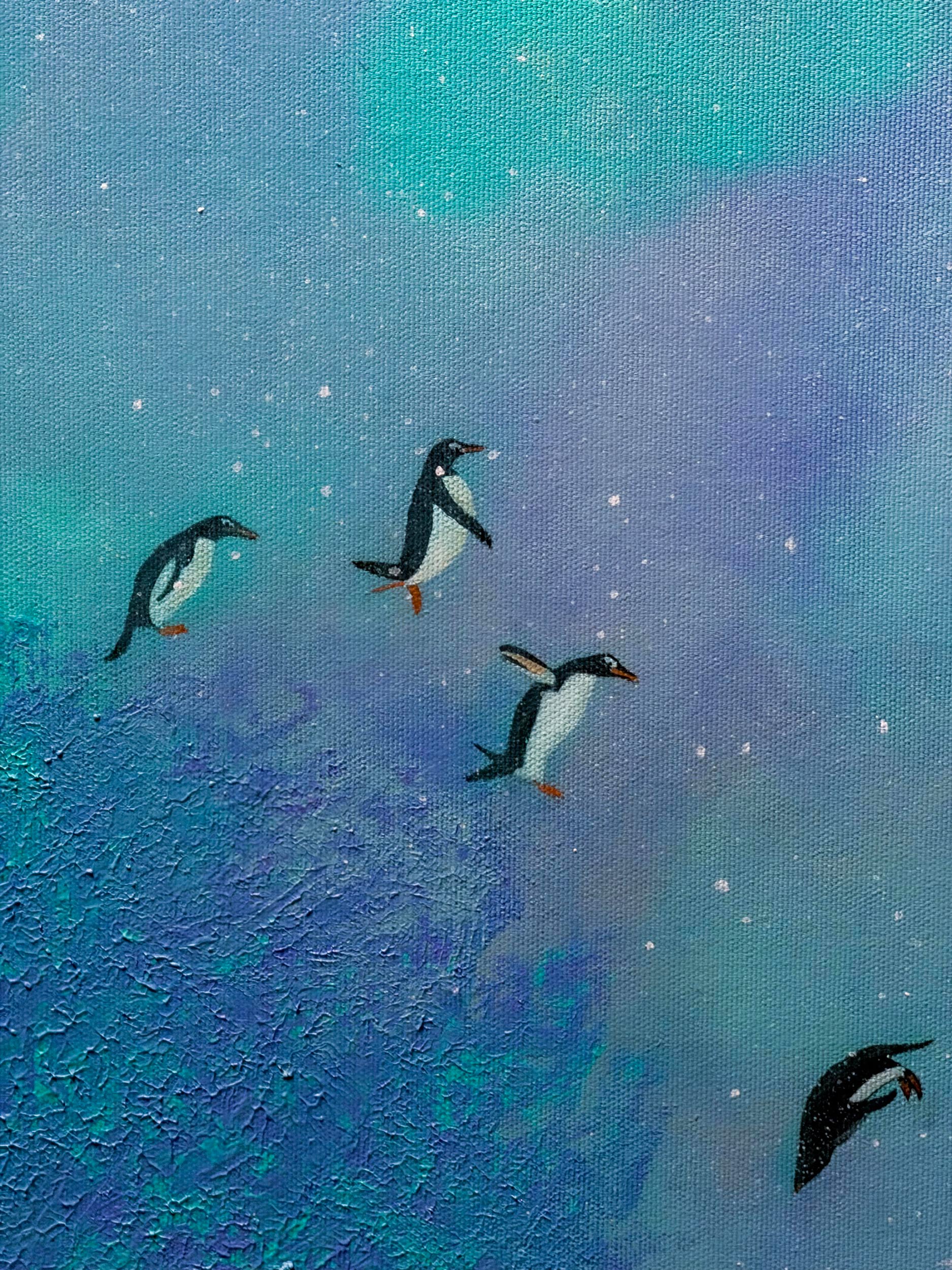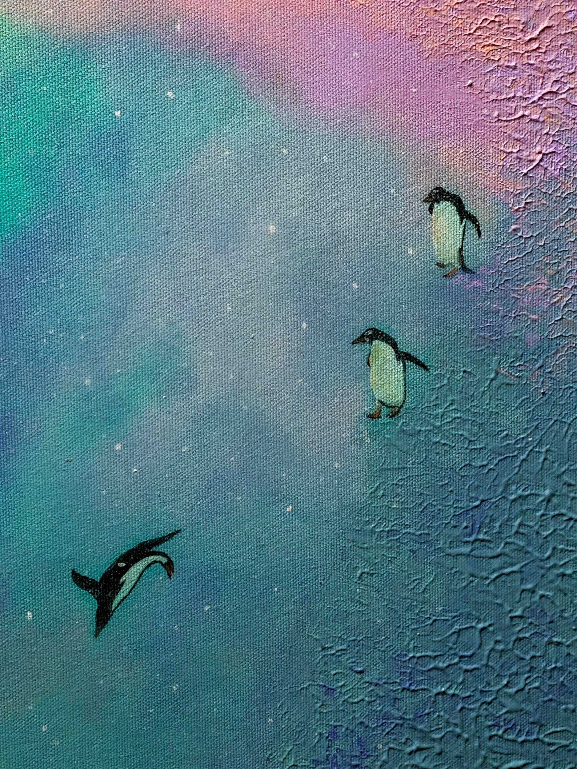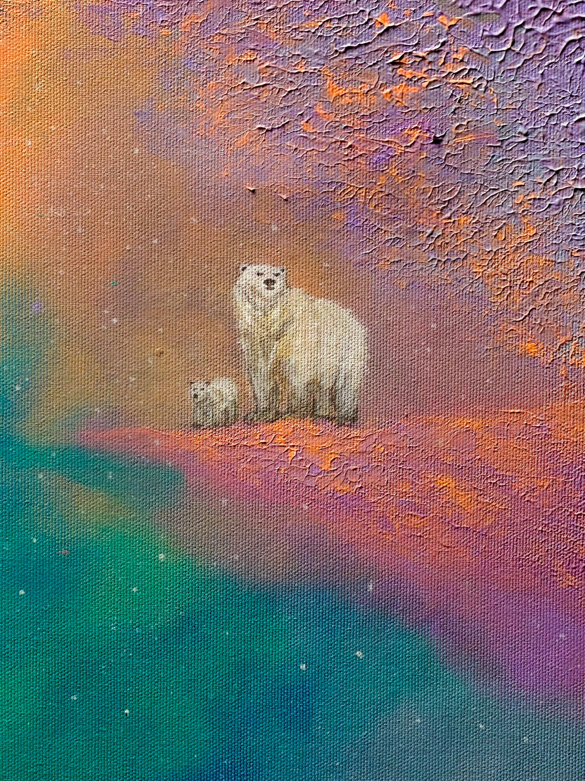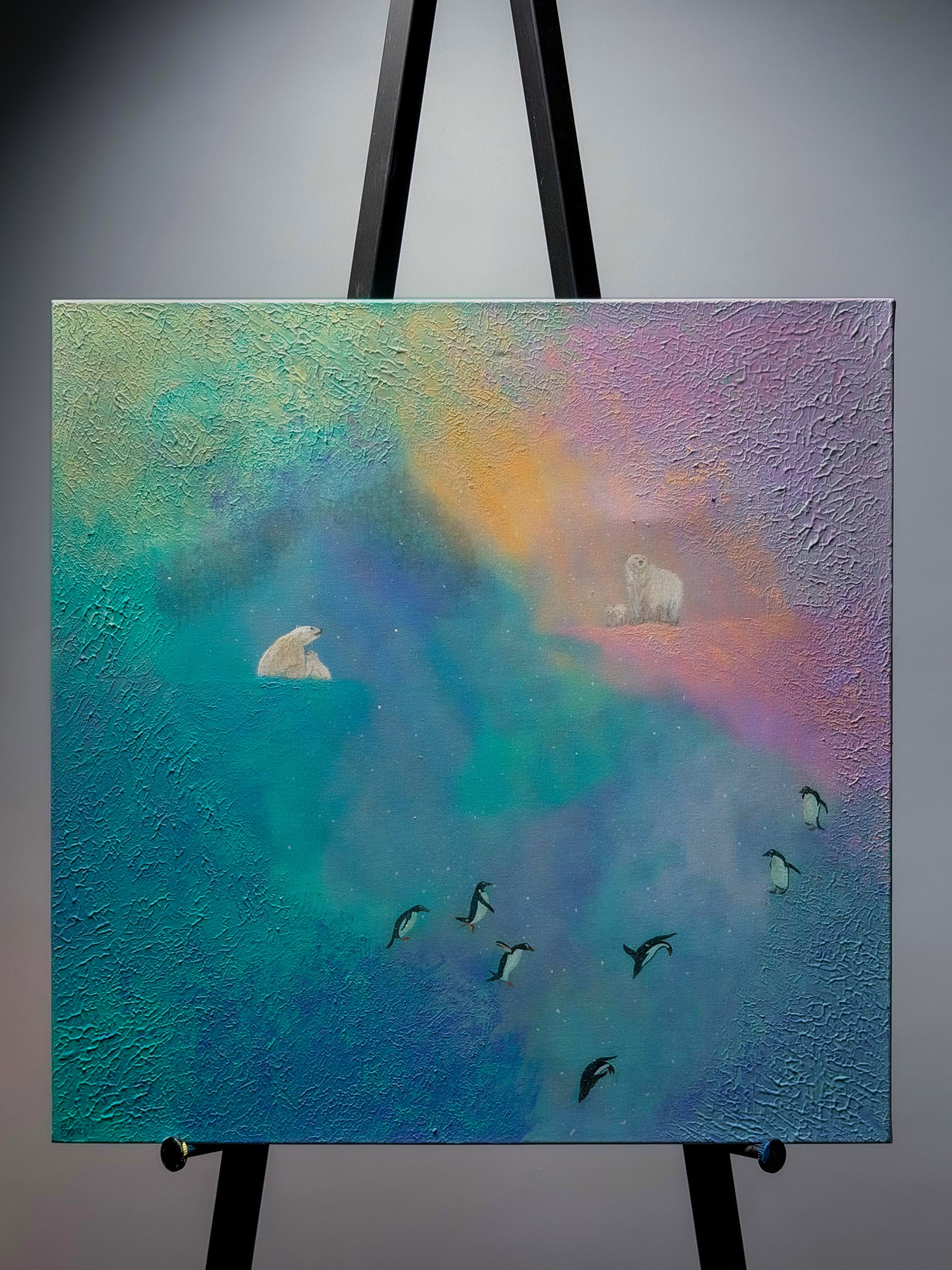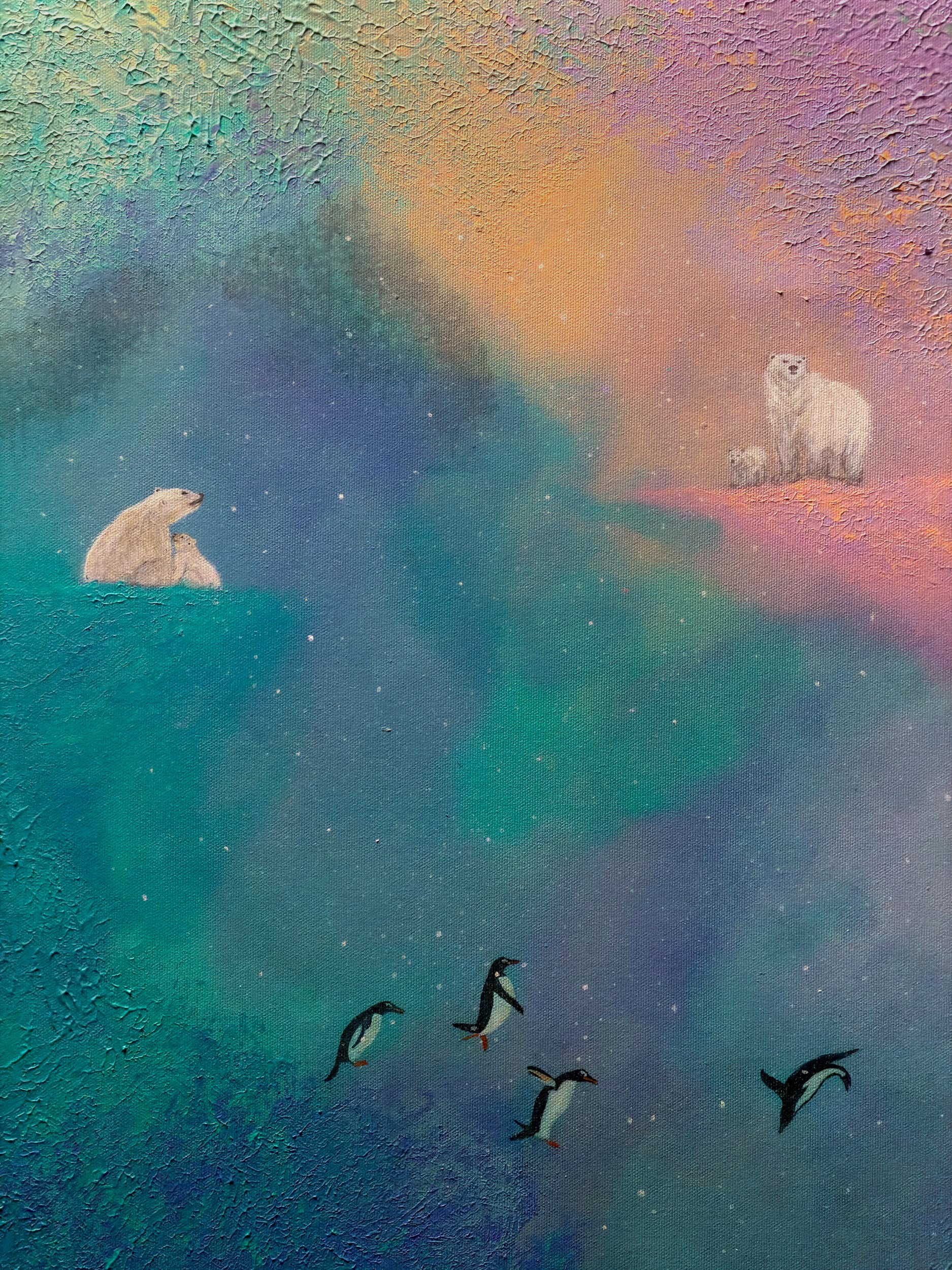 In this dreamlike universe where borders and distances lose their meaning, nature's most distant inhabitants hold a silent meeting. On one side, the white giants of the north, and on the other, the flightless birds of the south bridge the thousands of kilometers between them on this textured canvas. As penguins move forward, unsure if they are gliding through a deep blue sea or a starry nebula, polar bears watch them from a high hill, as if greeting a very old and familiar friend. In this magical corner of the universe, the cold gives way to a warm peace; all differences melt under the same sky, reducing the concept of "far" to just a word.