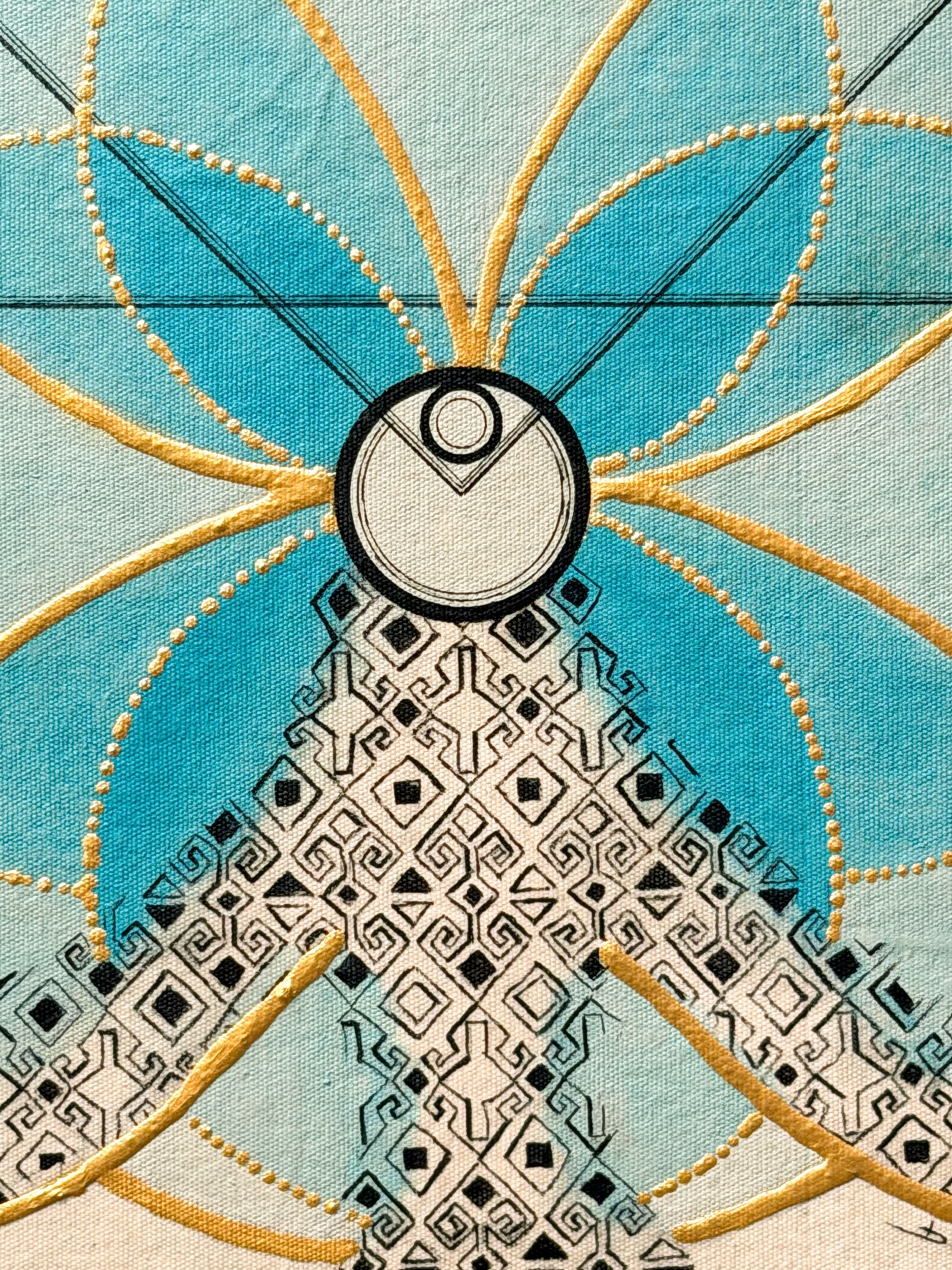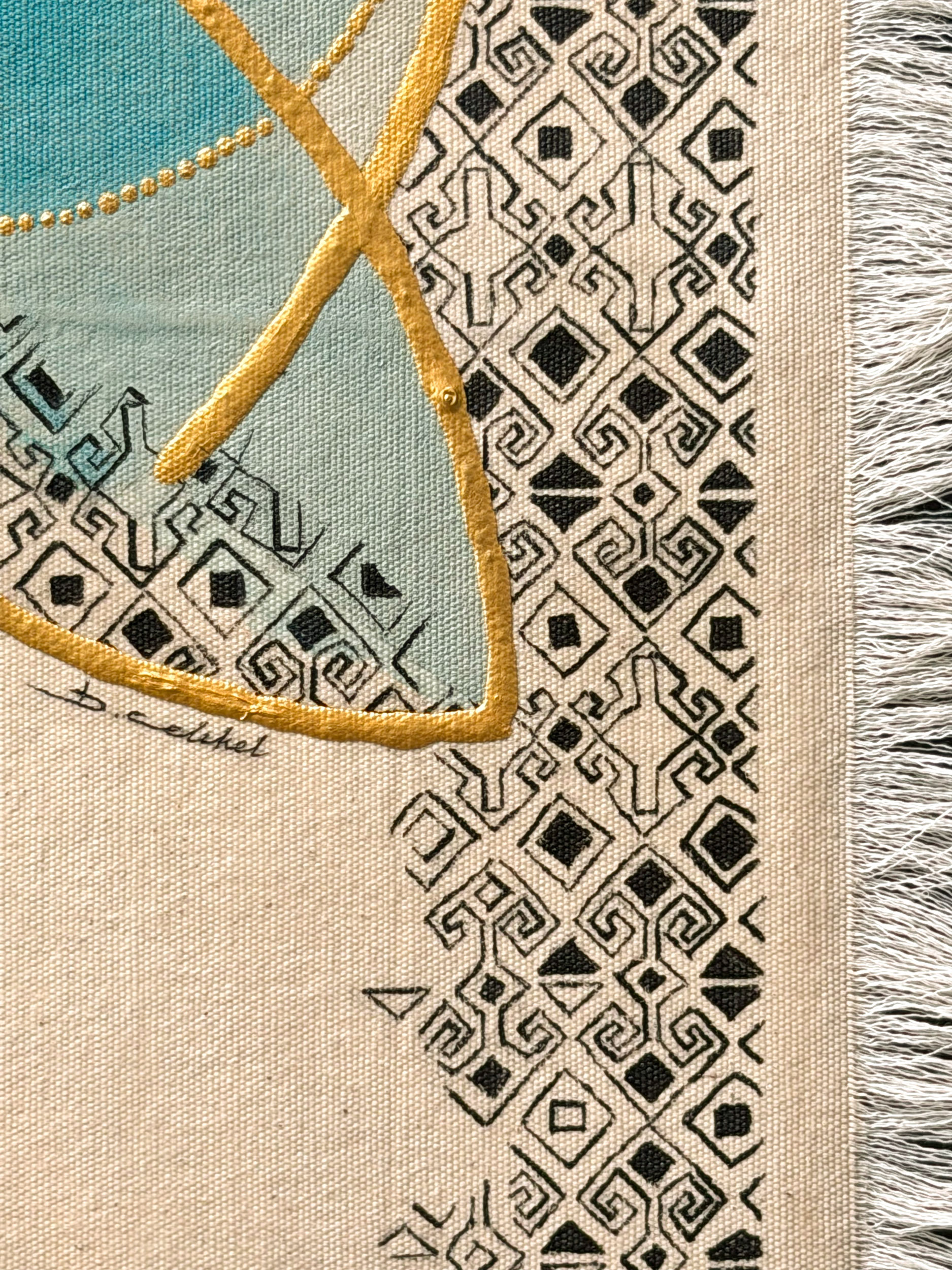 Man is not the owner of nature; he is a part and a protector of its perfect functioning. At the top of the composition, which places this idea directly at its center, the eight-pointed star symbolizes universal balance, while the chintamani motifs at the star's tips represent power and protection. The middle section, emphasized by the blue field, reflects the perfect mathematics of the universe—sacred geometry—connecting the great order in the sky to the earth. As the geometric lines descend, they evolve into the figure of Umay Ana, the protector of life.