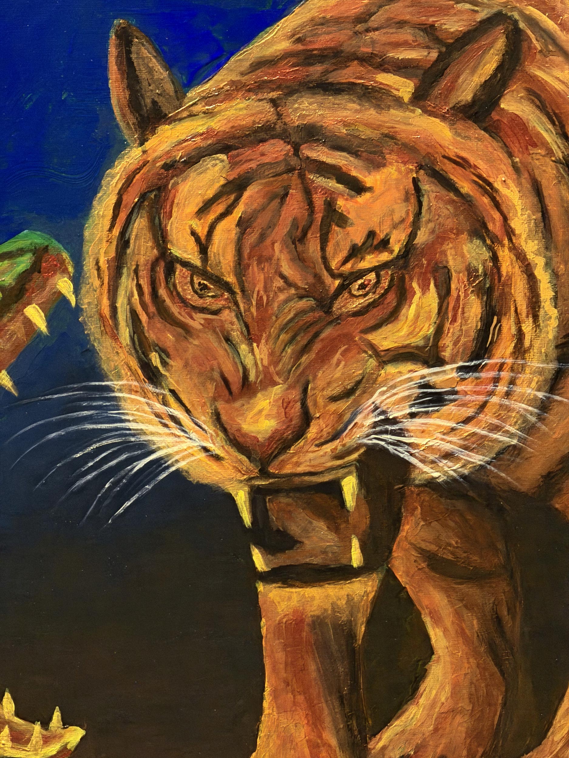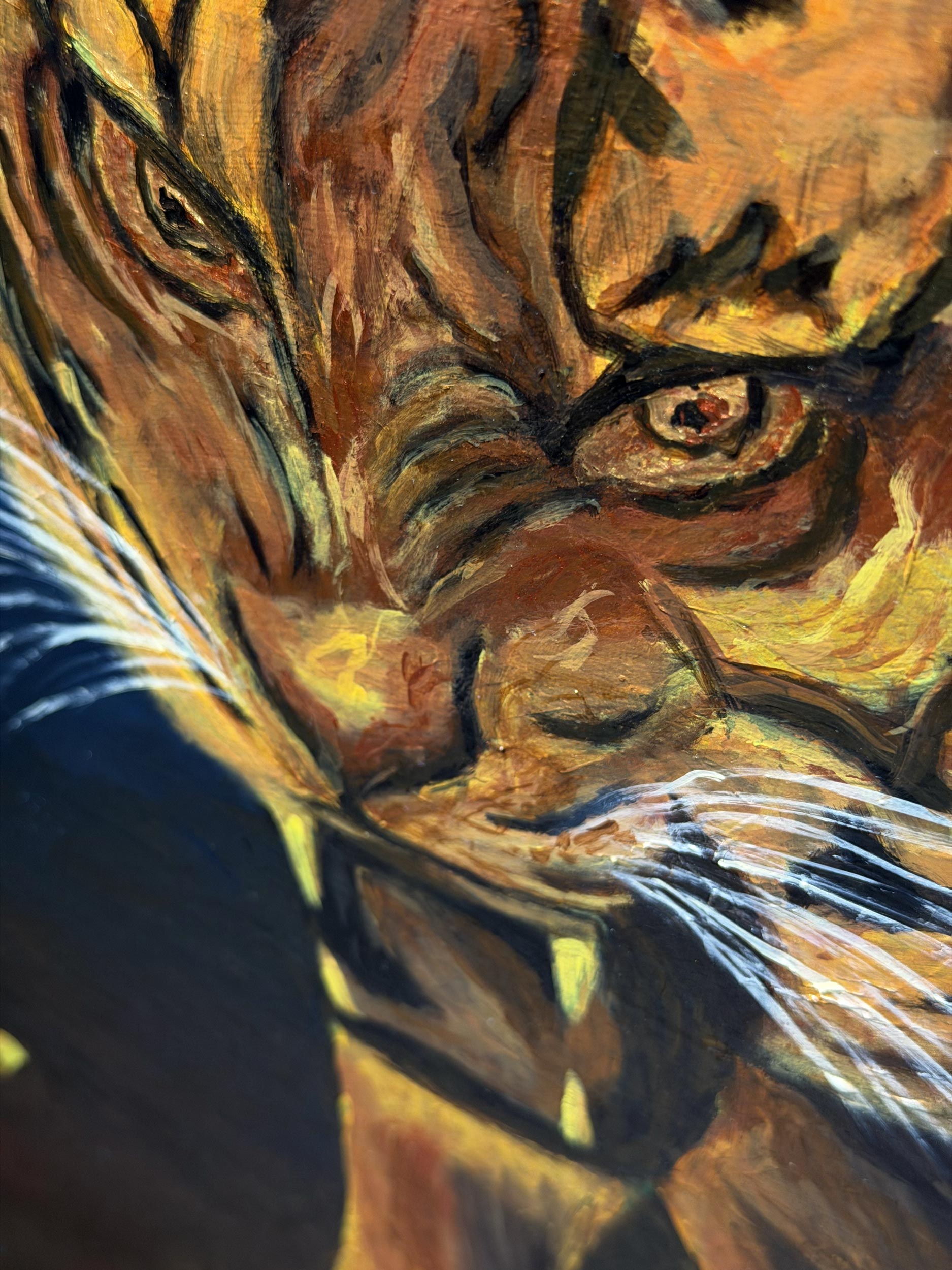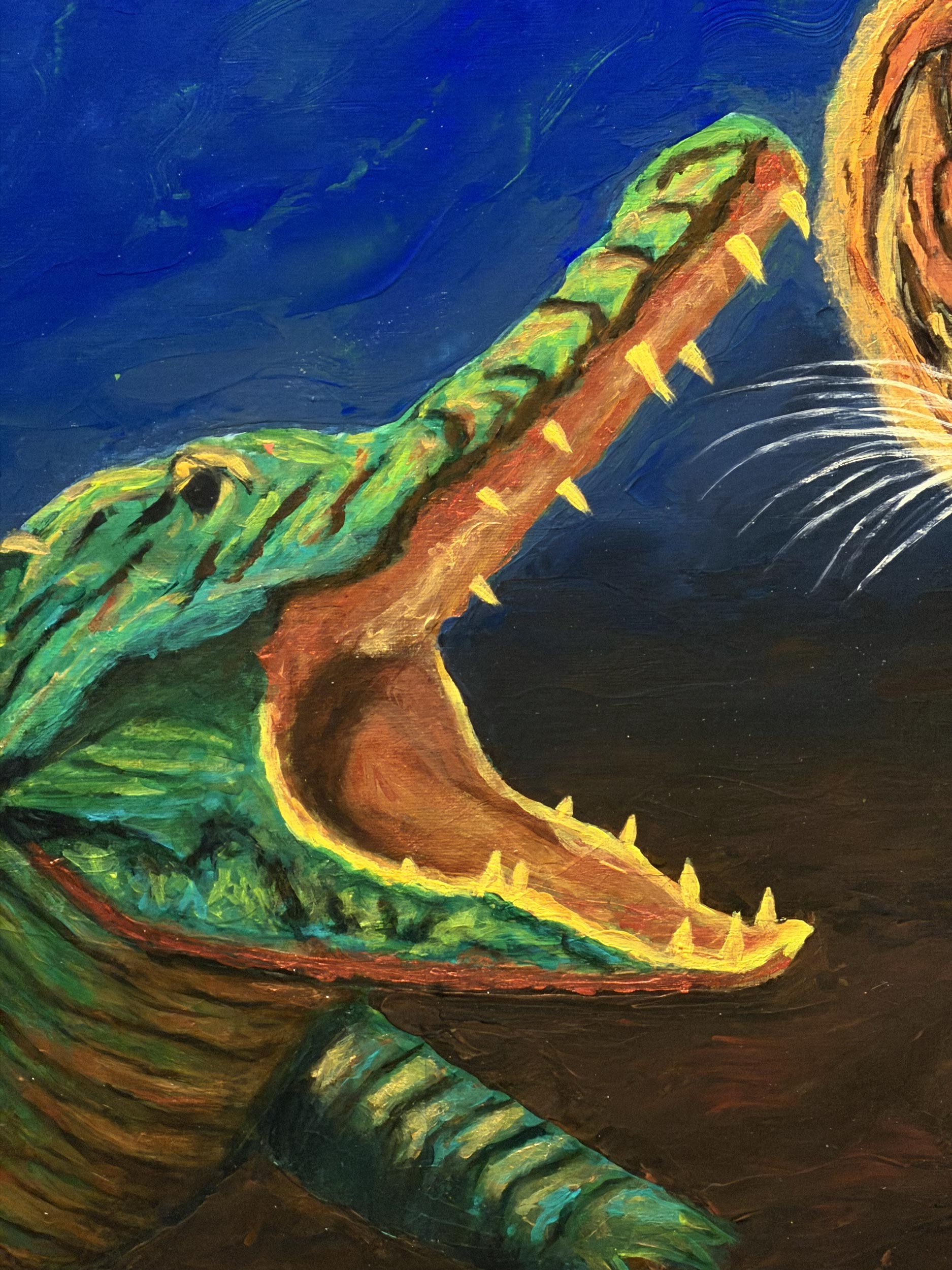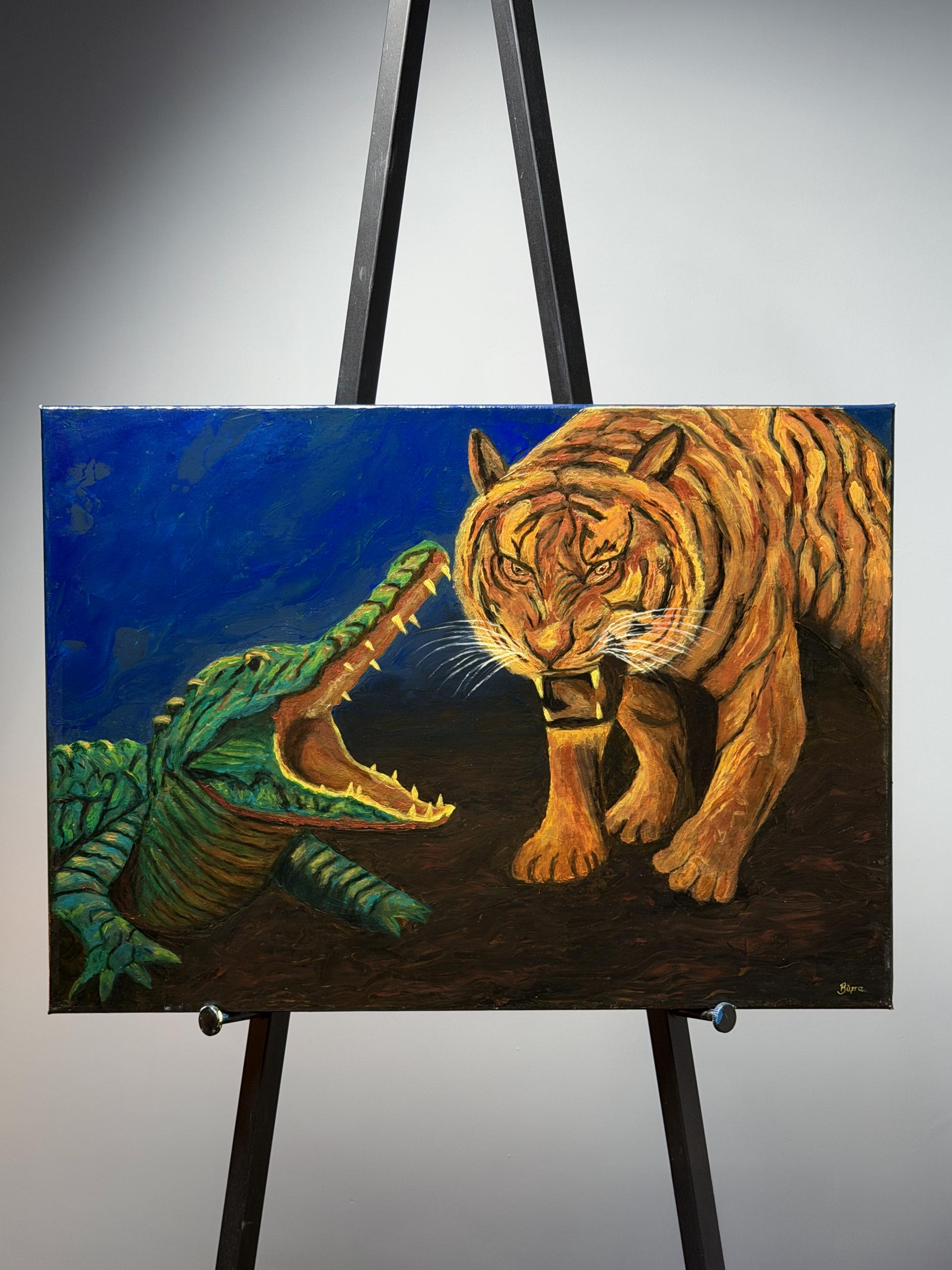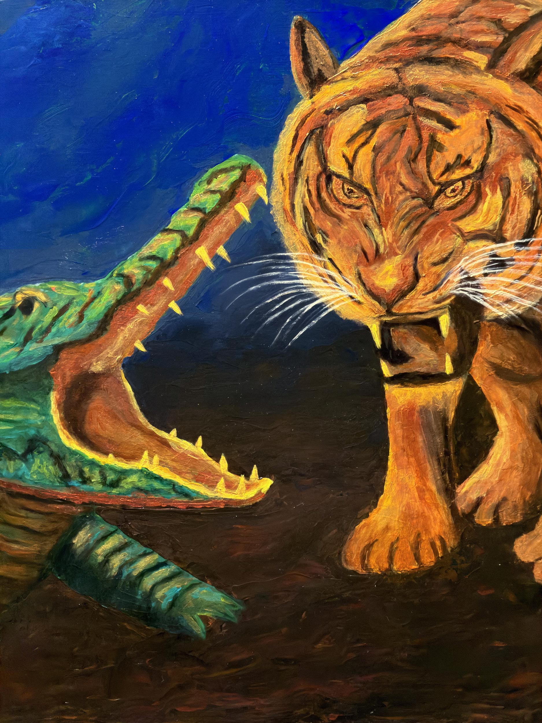 In the darkest blue of the night, the fiery soul of the forest and the cold armor of the river come face to face. While the tiger illuminates the darkness like a torch with its orange fur, the crocodile challenges it with the ancient power of patience and ambush. Both predators wait in that razor-edge silence just before the attack; this encounter is etched into the memory of nature not merely as a hunt, but as the eternal dance of fire and water.